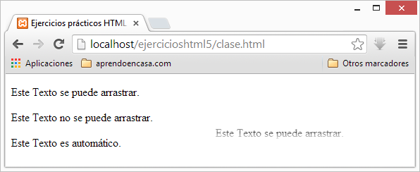 Los valores posibles para el atributo son: true, que especifica que el elemento se puede arrastrar, false, indica que no se puede arrastrar el elemento y por último auto, indicando que se deja al navegador la elección de posibilidad de arrastrar o no el elemento.